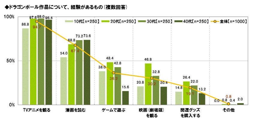 また、ドラゴンボール作品の原作にあたる漫画を読んだ経験がある割合は30代・40代に多く(30代73.2%・40代73.6%)、映画(劇場版)は20代(46.8%)が多くなりました。TVアニメは10代で8割半(86.8%)、20代~40代ではほとんどの方(20代97.6%、30代98.0%、40代96.4%)が観た経験があると回答しており、まさに世代を越えて愛されている国民的人気アニメであると言えそうです。