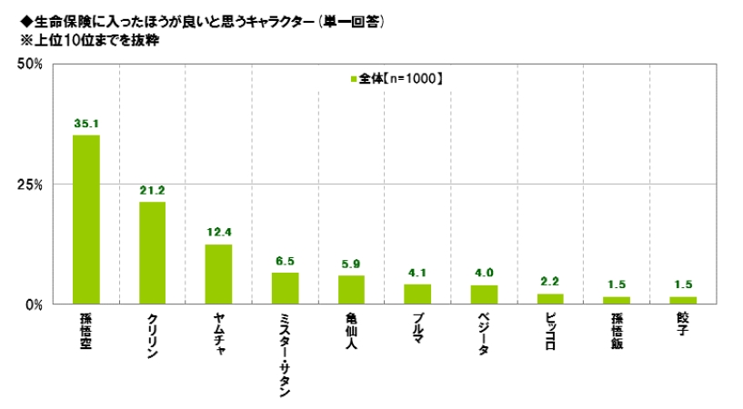 また、同様に生命保険が必要なさそうなキャラクターについても聞いたところ、1位「孫悟空」(24.5%)、2位「亀仙人」(16.0%)、3位「界王さま」(12.6%)となっています。圧倒的な人気や戦闘力を持っているためか、孫悟空さんは生命保険が必要なさそうなランキングでも1位となりました。