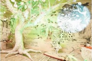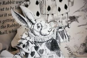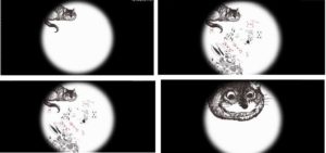 木の後方の壁には、チェシャ猫やウサギ、そしてトランプがアニメーションで次々と現れ