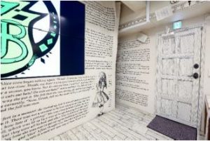 100平米の空間一面に不思議の国のアリスの世界が手描きで描かれ