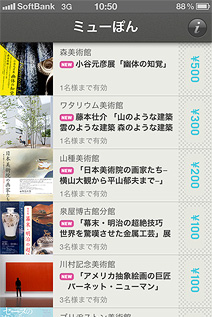 美術館割引券一覧アプリ『ミューぽん ver 1.0』です。