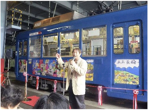 車体に長崎の観光名所の新作イラスト「ああ長崎……」が描かれており