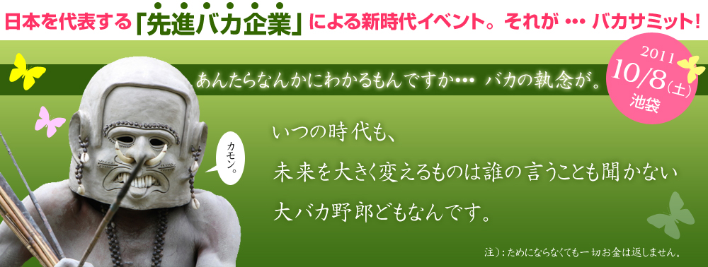 イベントを行う上で、これは本当のバカではない、アホとバカの違いは?バカにビジネスはできない・・・等、正直どうでもいい多くの意見があがり、論議されることでしょう。なので、本イベントで表現をしている「バカの定義」、伝えたい「バカ感」についてしっかりと触れておこう。