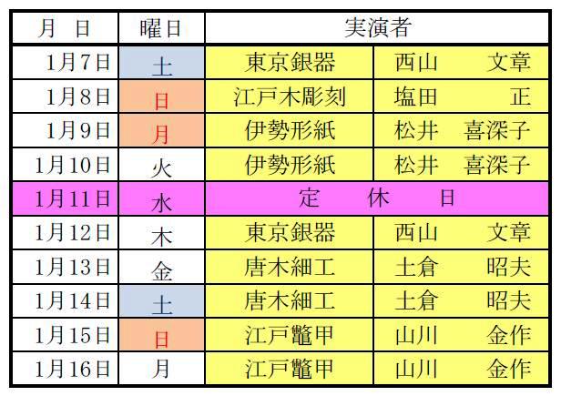 江戸木彫刻、江戸打刃物、唐木細工、江戸切子、東京銀器、硝子彫刻、伊勢形紙、銅版仏画、江戸鼈甲、印伝、東京打刃物、江戸木彫刻