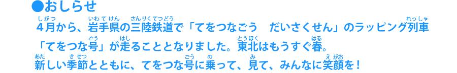 三陸鉄道さんのラッピング車両「てをつな号」として4/1から発車しています!